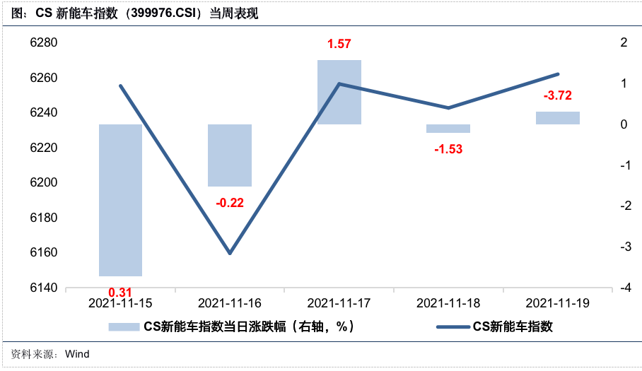 上周表现回顾:11月15日至11月19日跟踪标的新能源车指数(930997.CSI)呈现震荡行情,周三录得七日内最大涨幅1.57%,周五达到本周最大跌幅3,72%,截至周五收盘指数下跌3.62%,跑输大盘3.65%。