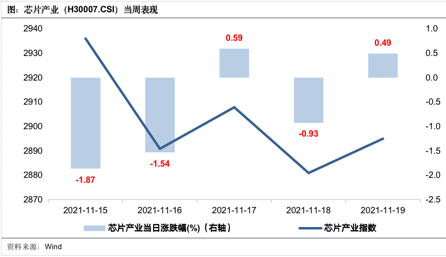 上周表现回顾:上周芯片产业指数震荡下行,周一周二跌幅较大,累计下跌3.24%,相较沪深300跑输3.27%。