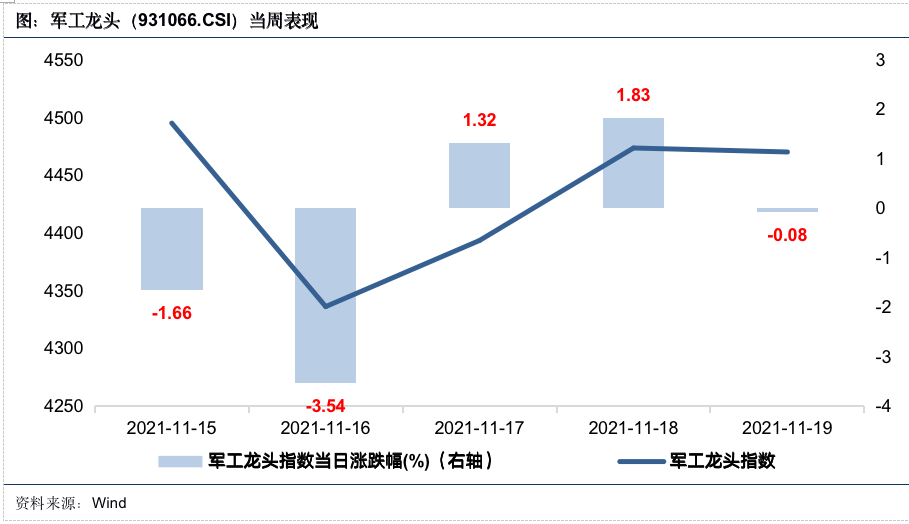上周表现回顾:上周军工龙头指数总体下行,全周涨跌幅为-0.56%。其中,周一、周二、周五下跌,跌幅分别为-1.66%、-3.54%、-0.08%,周三、周四上涨,涨幅分别为1.32%、1.83%;收于4470.12。