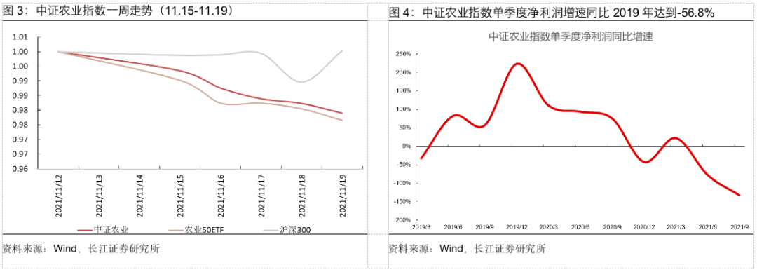 三季报情况:中证农业成分股全部公司均披露了三季报;由于前三季度猪价维持低位水平,单季度行业整体净利润为负;中证农业整体的三季报净利润增速到达-132.3%,行业整体增速仍在持续下行。