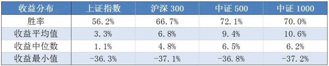 如果投资的是上证指数,未来半年赚钱概率是56%;如果投资的是沪深300、中证500、中证1000这类宽基指数,未来半年赚钱的概率能达到7成。
