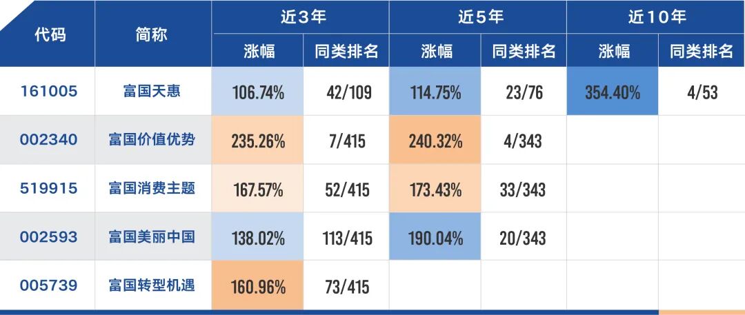 注:同类排名及相关数据来源银河证券,截至2022年2月11日。其中富国天惠同类为偏股型基金(股票上限95%);富国价值优势、富国消费主题、富国美丽中国、富国转型机遇同类为偏股型金基金(股票上下限60%-95%)。基金过往业绩及其净值高低并不预示其未来业绩表现。