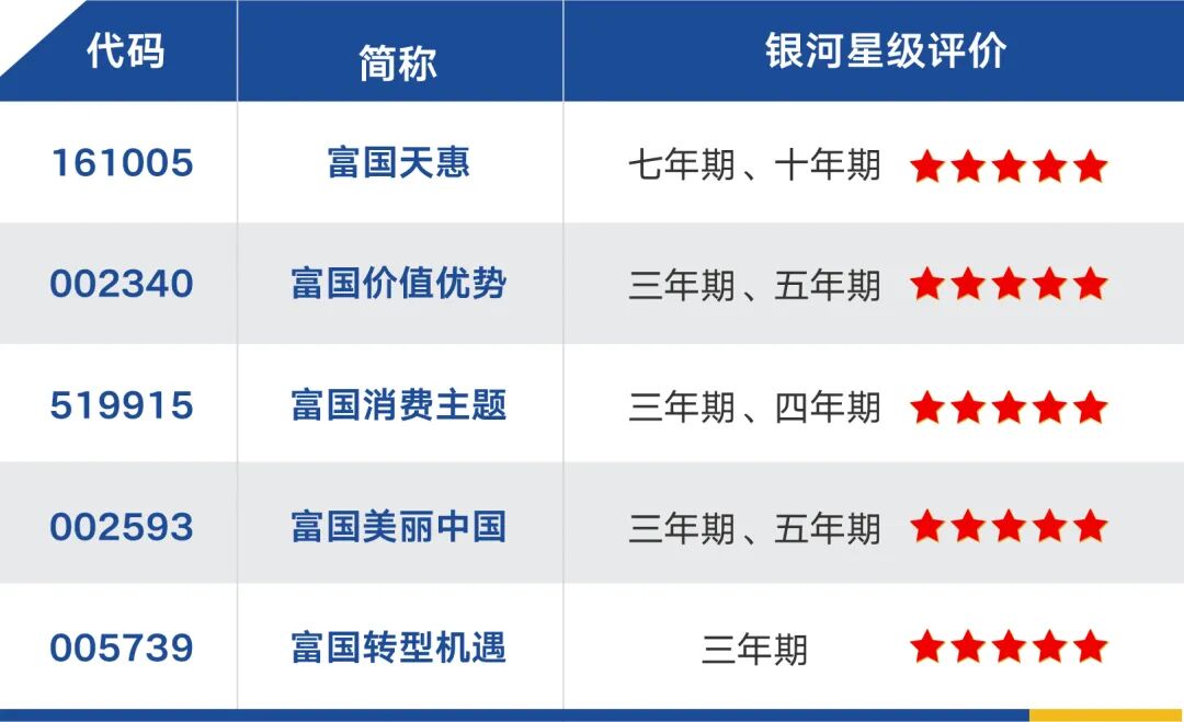 “优等生”当然也会受到专业评级机构的认可,包括富国天惠(161005)、富国价值优势(002340)、富国消费主题(519915)、富国美丽中国(002593)、富国转型机遇(005739)在内的几只产品,均获得了银河证券的五星评级。