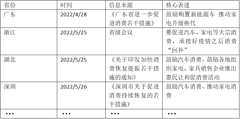 可以看到消费在2021年的经济增长中的贡献为65.4%,回到疫情前的水平,堪称经济增长的压舱石。那么如何去刺激消费,刺激消费的主要方向在哪里?根据每日经济新闻的报道,仅今年1-4月,全国至少20多个省市发放总额超过34万元的消费券,梳理发现,汽车和家电($家电ETF561120$)等大宗消费品是促消费重点关注的方向。尤其在昨日的视频会后,部分省市立马发布了促进消费尤其是汽车与家电的措施,比如今日深圳市发布的促进消费的九大措施中,第一条为推动汽车消费(包含购车补贴及指标发放等10条细则)、第三条为促进家电消费(15%的补贴、保障房工程)。
