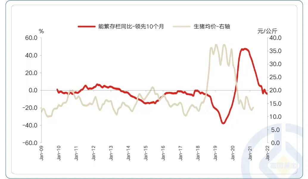 既然猪肉价格由供需决定,那么“供不应求”的时候,猪肉价格就会上涨。市场上能买到多少生猪,由养殖户养殖了多少母猪决定。短周期视角来看,母猪生出仔猪需要约4个月,仔猪长大可以到市场上售卖需要大约6个月,因此从母猪到生猪出栏大约需要10个月,也正因如此,养殖户养殖的母猪数量是判断未来10个月市场上生猪供给和价格的领先指标。