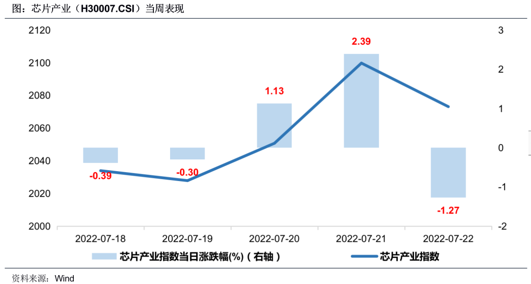 上周芯片产业指数,周一周二调整,周三周四大幅上涨,周五下跌。指数全周累计上涨1.56%,相较沪深300指数跑赢1.79个百分点。