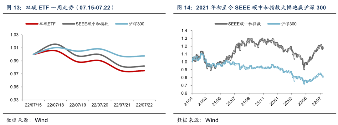 上周SEEE碳中和指数的收益率-1.8%,跑输沪深300的-0.2%;SEEE碳中和指数整体行情波动大于沪深300。SEEE碳中和指数年初至今的收益率为-8.0%,跑赢沪深300的-14.2%。