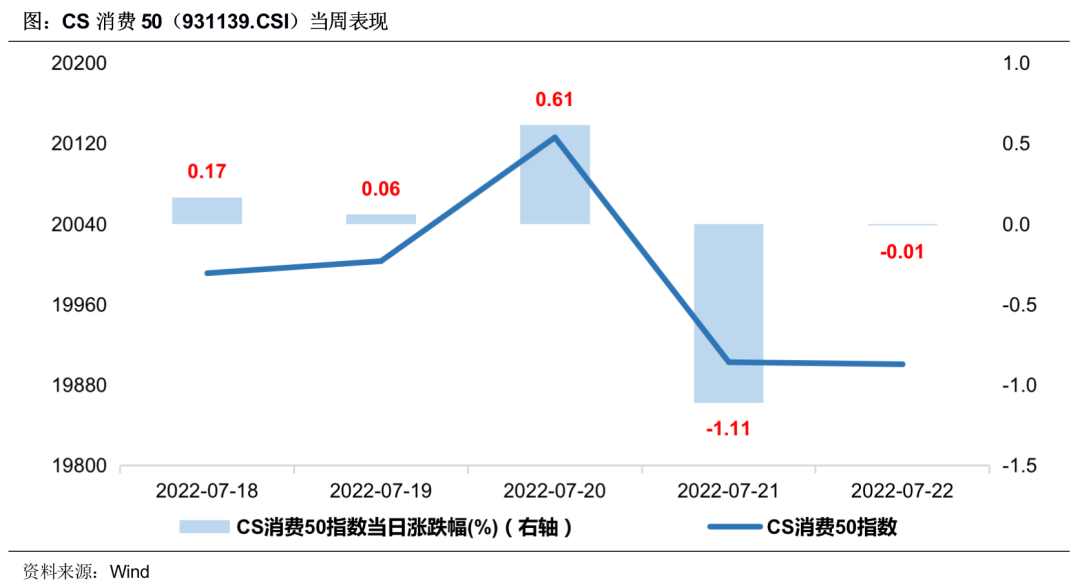 上周CS消费50指数周一到周三小幅上涨,周四下跌,周五调整。指数全周累计下跌0.28%,相较沪深300指数跑输0.05%。