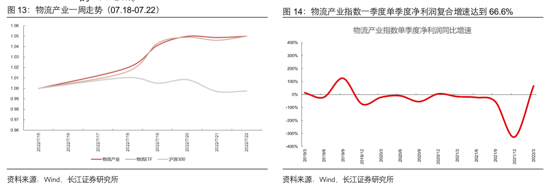 年报&一季报情况:受供需关系仍然紧平衡的影响,物流行业景气度维持高位。物流产业成分股全部公司均披露了年度报告和2022年一季度报告,指数整体2021年全年净利润增速为-82.9%;2022年以来板块业绩大涨,行业2022年一季度净利润增速为66.6%,净利润增速较高,后续业绩的较高增速或仍将维持一段时间。