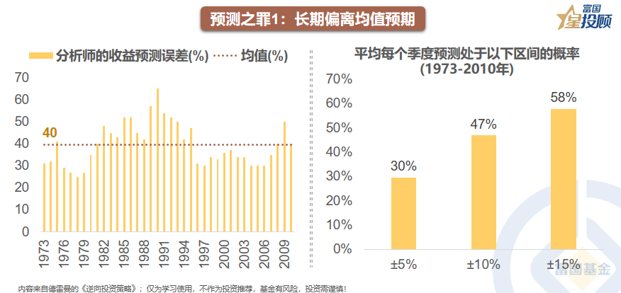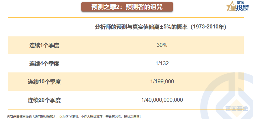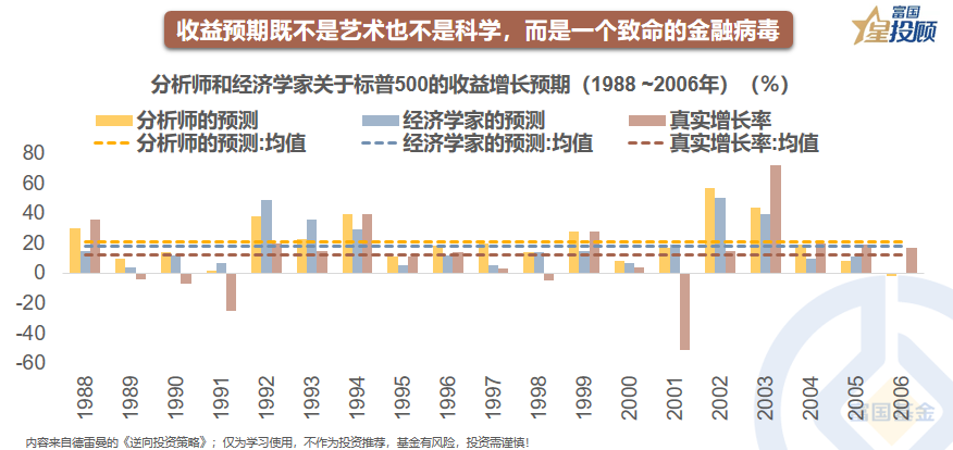 短期内的预测结果,成功概率非常小,这意味着通过精准预测来持续挣钱的可能性微乎其微。核心是大部分预测都只是简单的线性外推,而事实上,收益是随机漫步的,过去增长率和未来增长率并没有必然的相关性。