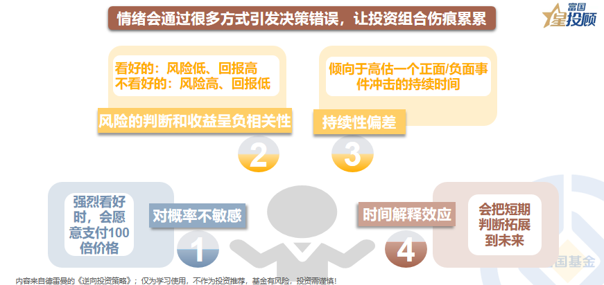 一是对概率不敏感:如果强烈看好某项投资,会愿意支付高于其真实价值100倍的价格。二是风险的判断和收益呈负相关性:看好的认为风险低、回报高,不看好的认为风险高、回报低。三是持续性偏差:倾向于高估一个正面/负面事件冲击的持续时间。四是时间解释效应:会把短期判断拓展到未来。